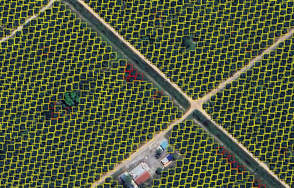 Palm tree detection application supports the automatic identification, counting of individual trees, and estimation of plantation area using high-resolution satellite imagery (0.3m and 0.5m).